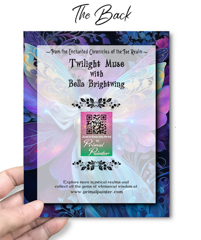 Bella Brightwing is a playful, colorful Fae guardian and twilight muse for the creative process. She uses color as a healing tool and plants seeds of inspiration in the quiet space between light and dark. Her quote and backstory are on the inside: