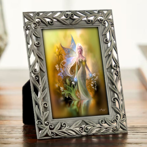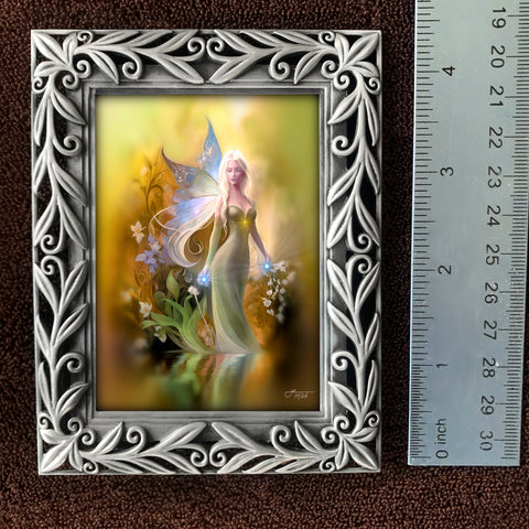 Created and signed by Primal Painter, this series of framed mini fairy prints comes with a matching story card, making them a magical gift for fairy lovers. The framed mini print comes in a teal jewelry box. Each Guardian is connected to nature and offers a touch of wisdom from the Enchanted Chronicles of the Fae Realm. Collect them all to complete the Circle of Light.