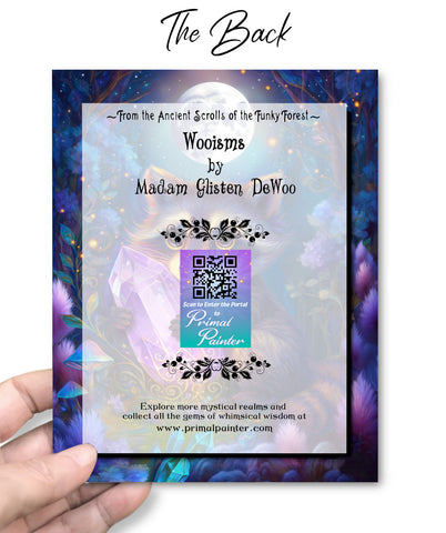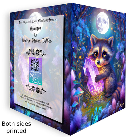 The raccoon tribe in the Funky Forest has added magic to their covert bandit activities. Meet Madam Glisten DeWoo, the sweetest raccoon in the tribe who fancies herself as a seer, a fortune-teller...and somehow French. Under a full moon and hugging her amethyst crystal in her favorite purple and blue dreamy forest clearing, she reminds us not to get distracted by every shiny object that comes our way. Her quote and advice are on the inside: