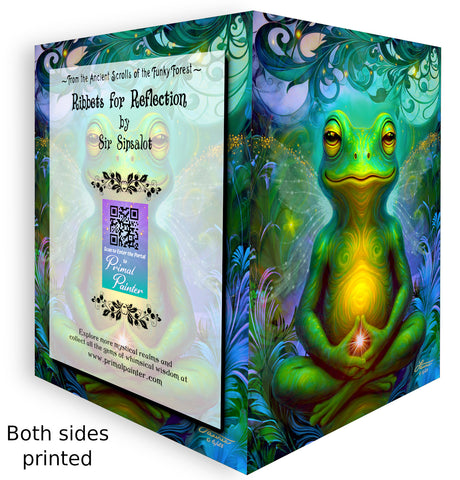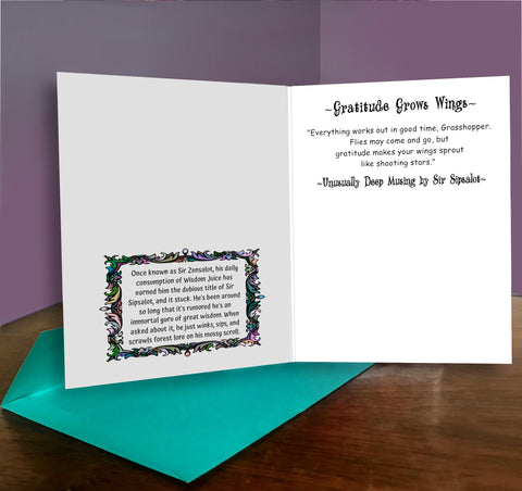 Sir Sipsalot is a multi-talented frog guru and official scribe of the Ancient Scrolls of the Funky Forest. Sitting cross-legged in the lotus pose under the night sky, eyes half-closed, chakras glowing, he reminds us that gratitude helps our wings sprout, even when the going seems rough. His quote and advice are on the inside: