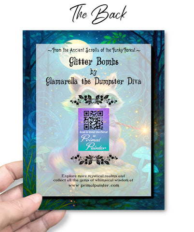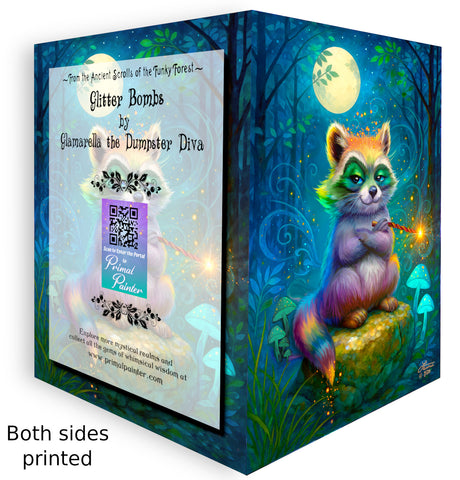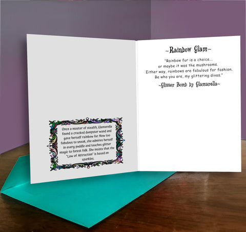 The raccoon tribe in the Funky Forest has added magic to their covert bandit activities, and Glamarella is the flashiest dumpster diva in the tribe. A magical misfire turned their fur rainbow-colored, but they embraced the dazzle and became the diva they were meant to be. They remind us that not everyone has to be the same, and it's ok to be different and unique. Their quote and advice are on the inside: