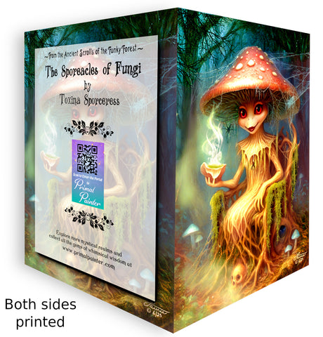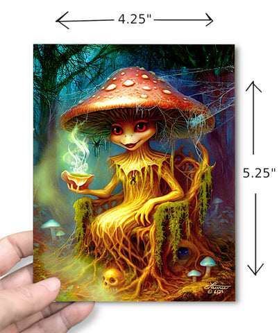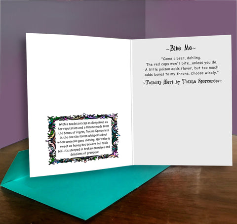 Colorful and delightfully wicked greeting card that's both playful and spooky…Who knew? Toxina Sporceress, the Funky Forest’s scariest toadstool from the Sporeacles Tribe, is here to bring a little poison-laced magic to your day. Sitting on her creepy throne of roots, draped in cobwebs and Spanish moss, and holding a bubbling toxic brew, she reminds us that a little poison adds flavor...but too much can add bones to her throne.