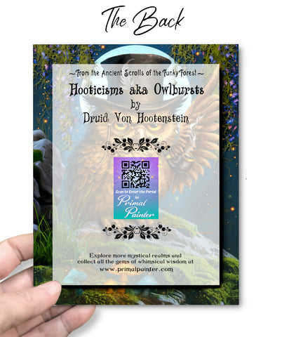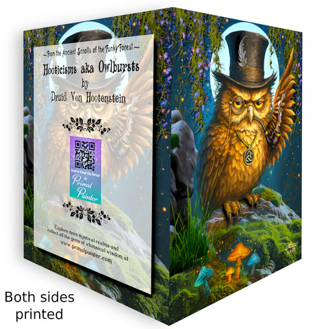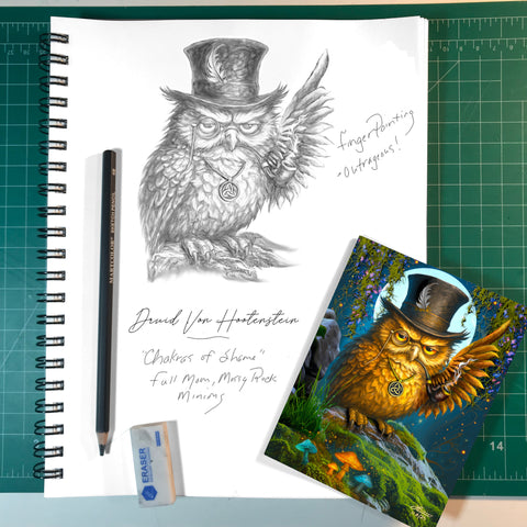 Clever and delightfully absurd, Druid Von Hootenstein perches on a rock with one wing pointing toward the sky, full moon glowing behind him, glaring at his mushroom minions. His pompous decree on misaligned chakras is delivered with a dramatic flair only the Funky Forest’s snarkiest owl can muster. His insult and sass are inside: