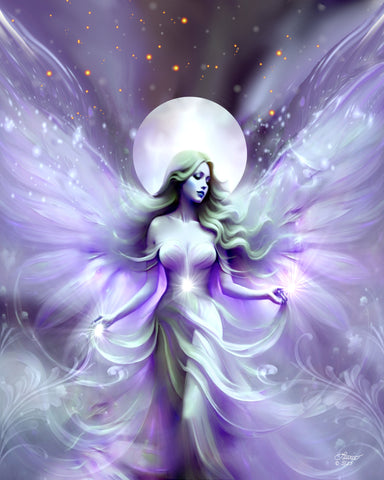 Seraphina Moonsong, one of the most mystical and wispy of the Fae guardians, guides and communicates through the magic of lunar alchemy. With soft, feminine pastel colors of violet, silver, and white, she uses the violet flame to transmute and transform the negative into the positive.
